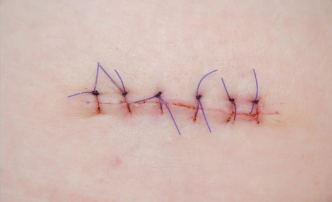 Standard dermatological suture placed on patient. Picture shows one week of recovery post-op.