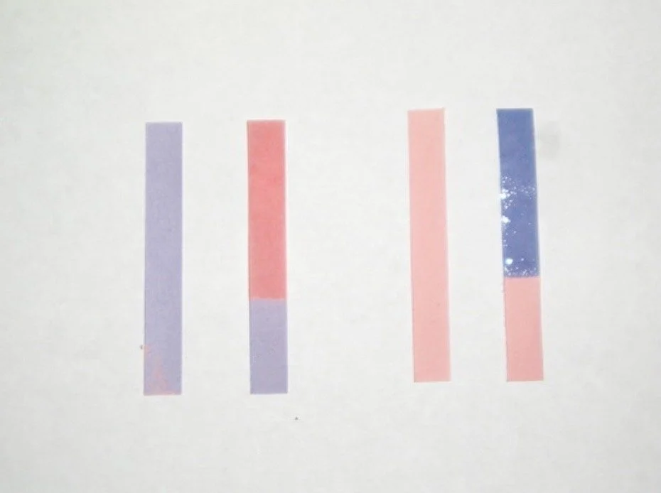 Red litmus paper turning blue in basic conditions and blue litmus paper turning red in acidic conditions.